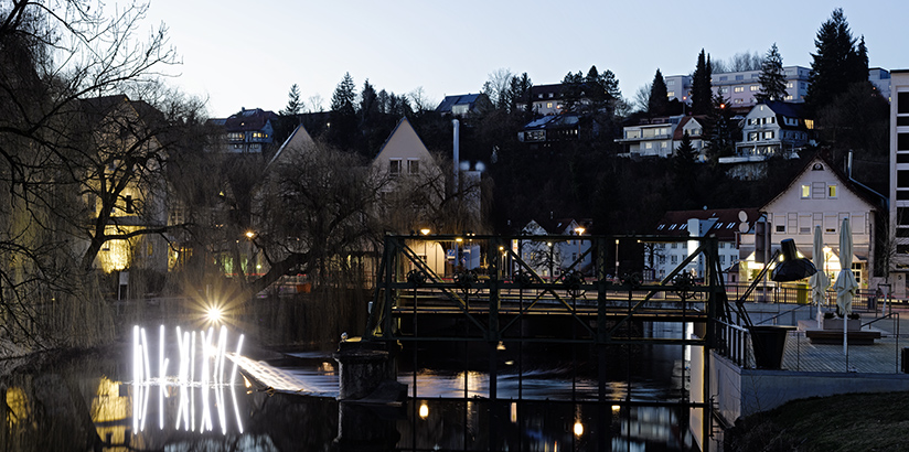 1. Dezember 2020 Murr-Wehr und Lichtplastik von Sebastian Hempel – Backnang, Murrpromenade